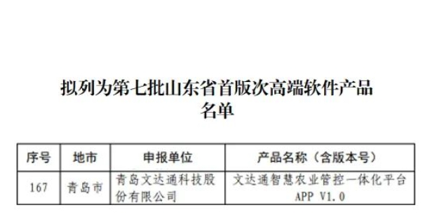 文達(dá)通股份“文達(dá)通智慧農(nóng)業(yè)管控一體化平臺 APP V1.0”入選第七批山東省首版次高端軟件產(chǎn)品名單